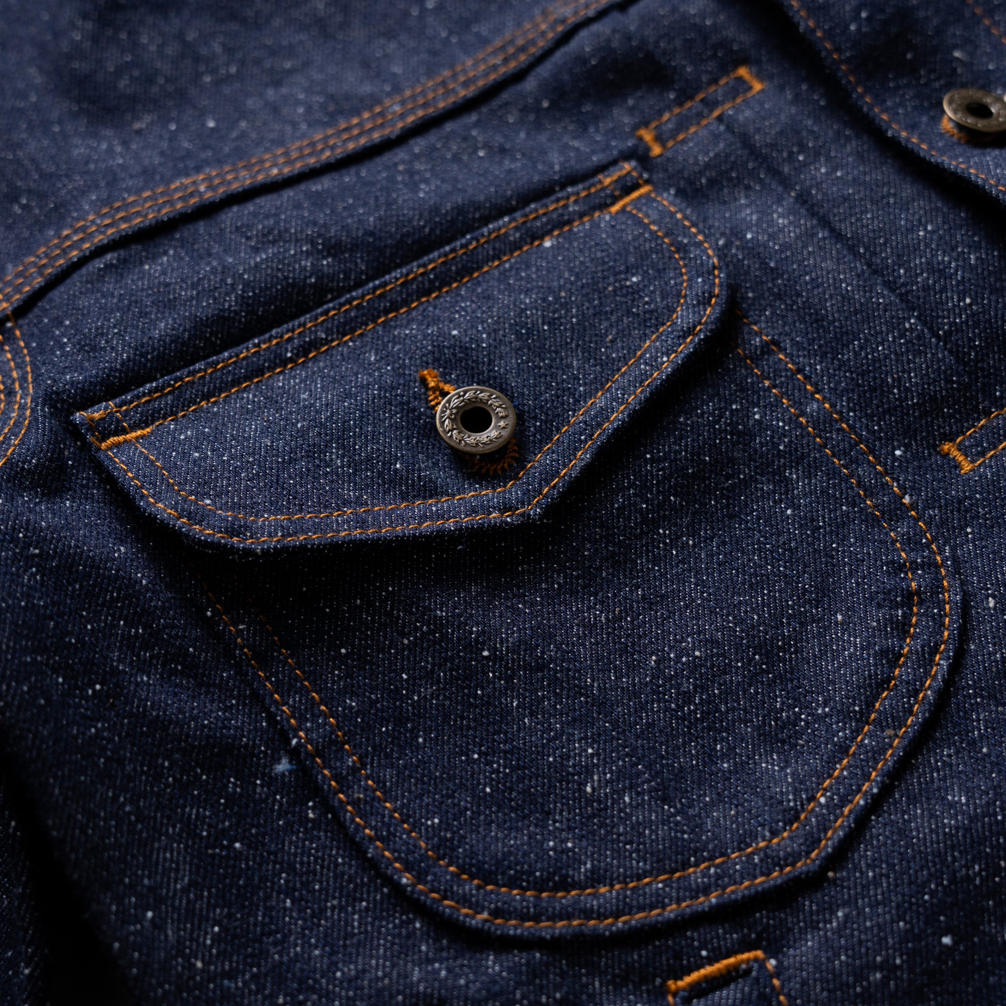 Our mission at Brave Star is to constantly seek out unique weaves and dye processes made in small batch runs.The selvage denims we gravitate toward emphasize the beauty and color spectrum of rope dyed indigo. With Blizzard we take that one step further using a dense 'nep' yarn in the weave. The white neps are the result of the ginning and carding process where the amount of mechanical neps are controlled. We've also used a soft hand yarn known as pearl yarn that is excellent for dye uptake and is a pleasure to wear due to the comfort and feel against the skin. An exceptional and unique selvage denim that is rarely seen Stateside.