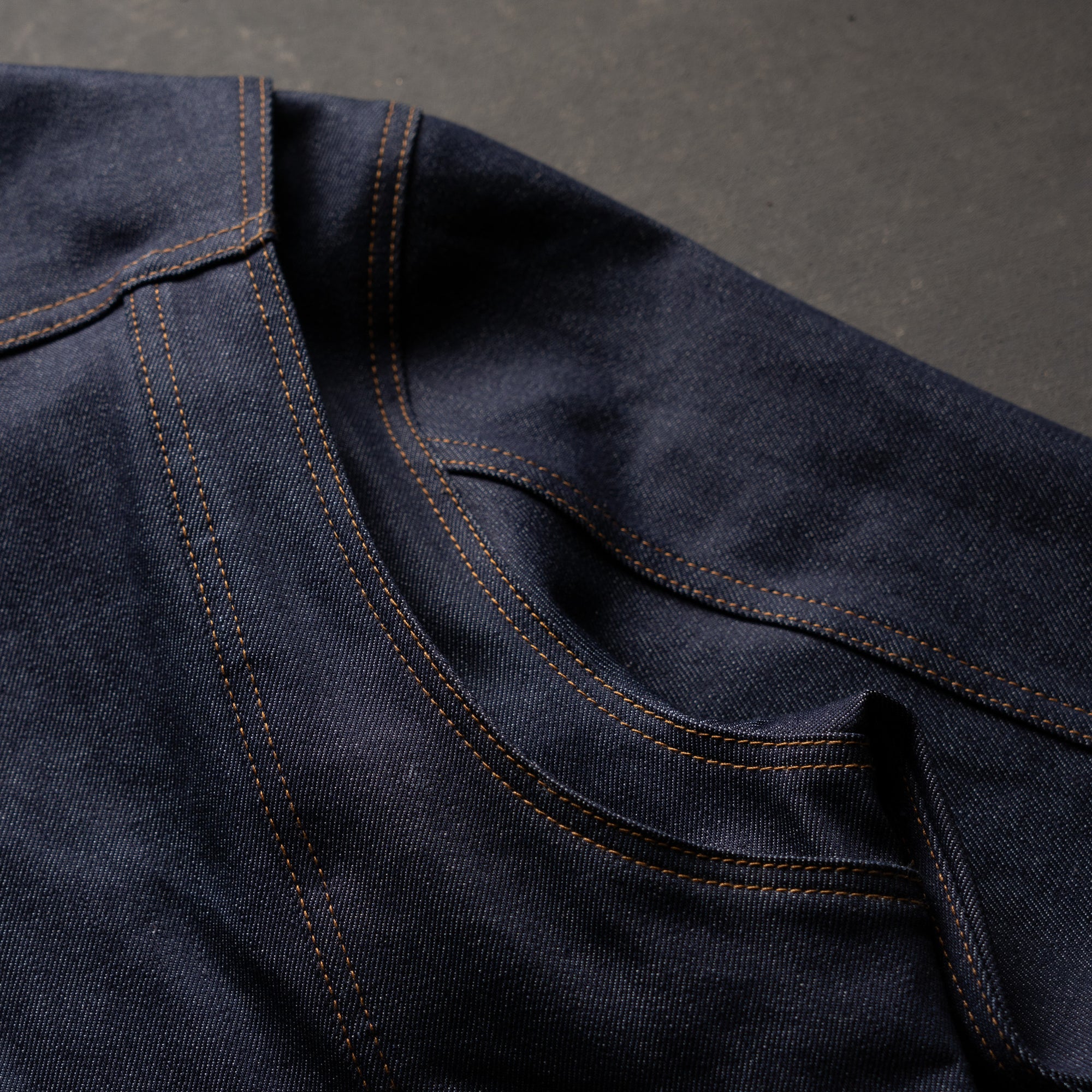We added shoulder gussets with hidden 1.5" elastic bands, engineered to flex when you move and snap back to shape, like a gas strut. It’s a game-changer if you’ve ever felt boxed in by a classic trucker fit.