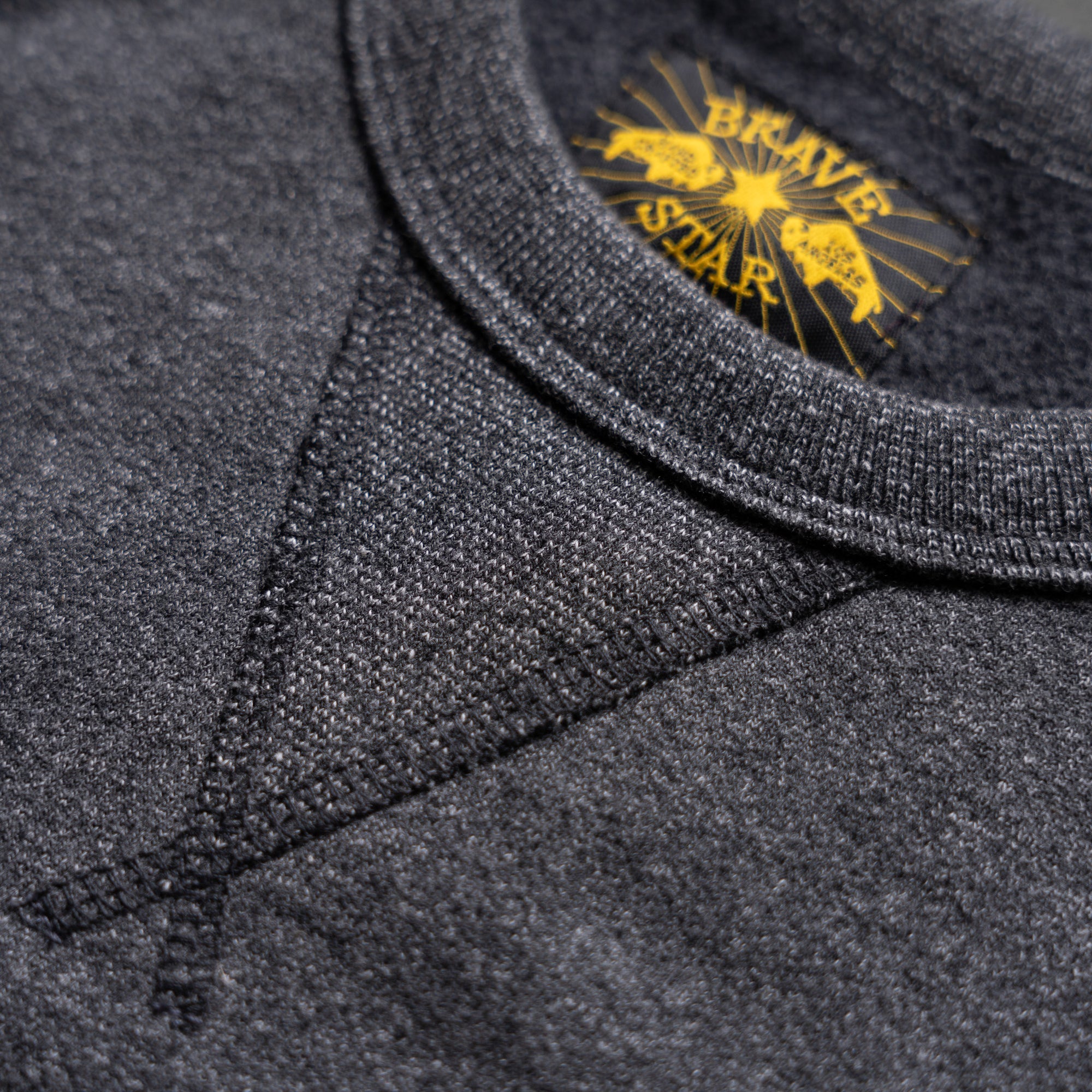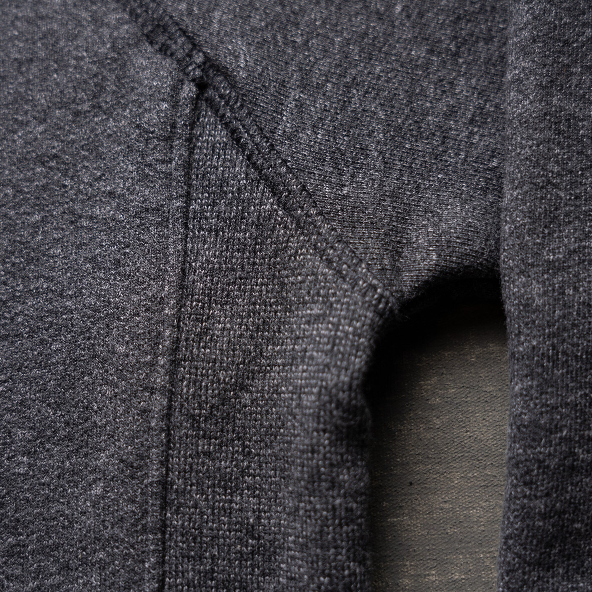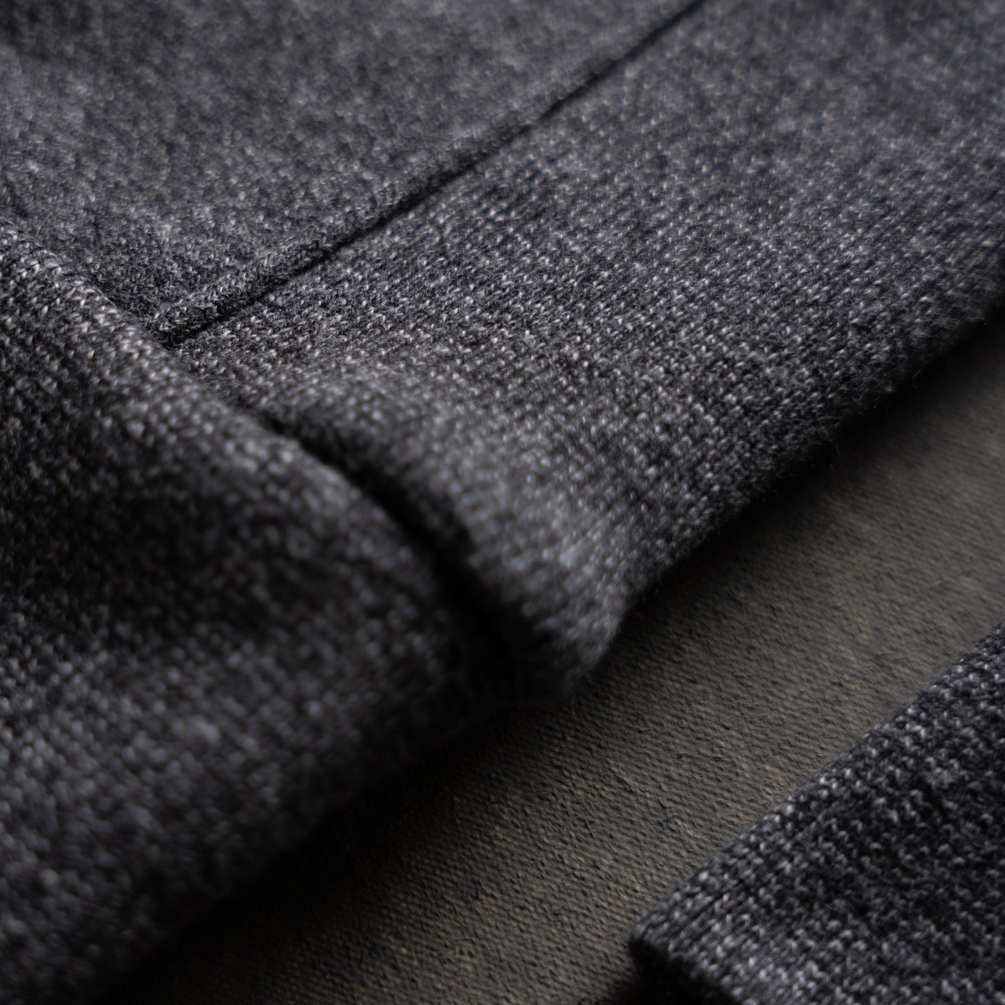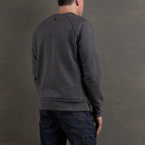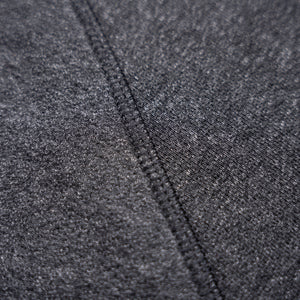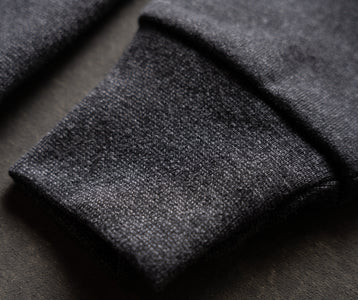 The fabric is a rugged mix of yarn-dyed greys that blend into a rich, peppery black—subtle heathering with a punch of attitude. The interior is brushed for heat-retaining comfort, giving it a soft, insulated feel without sacrificing weight or toughness. Finished with a matching 2x1 rib for a clean, durable structure. Designed to handle wear, weather, and time.