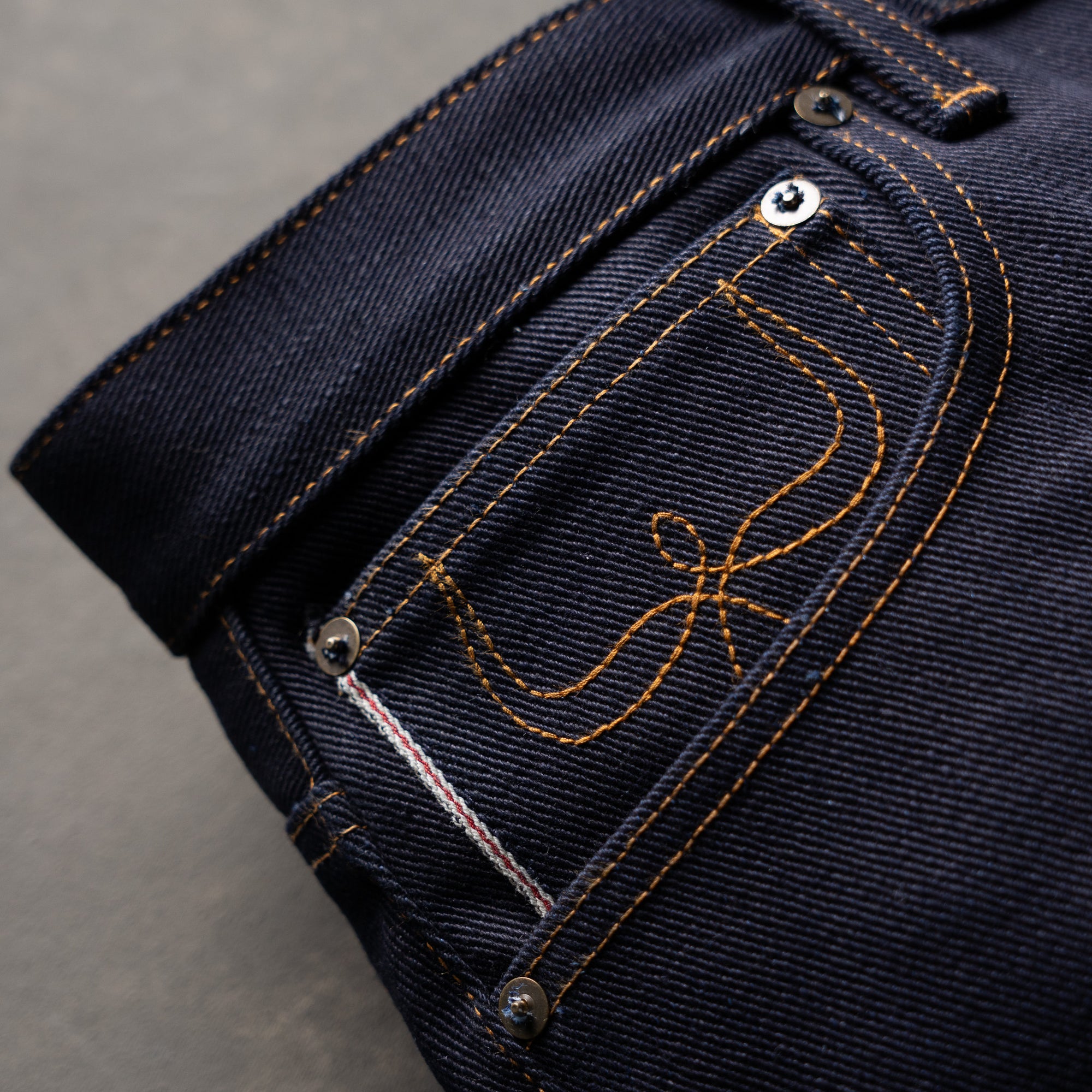 • Button fly with double prong, donut style buttons. Old style pocket rivet burrs.