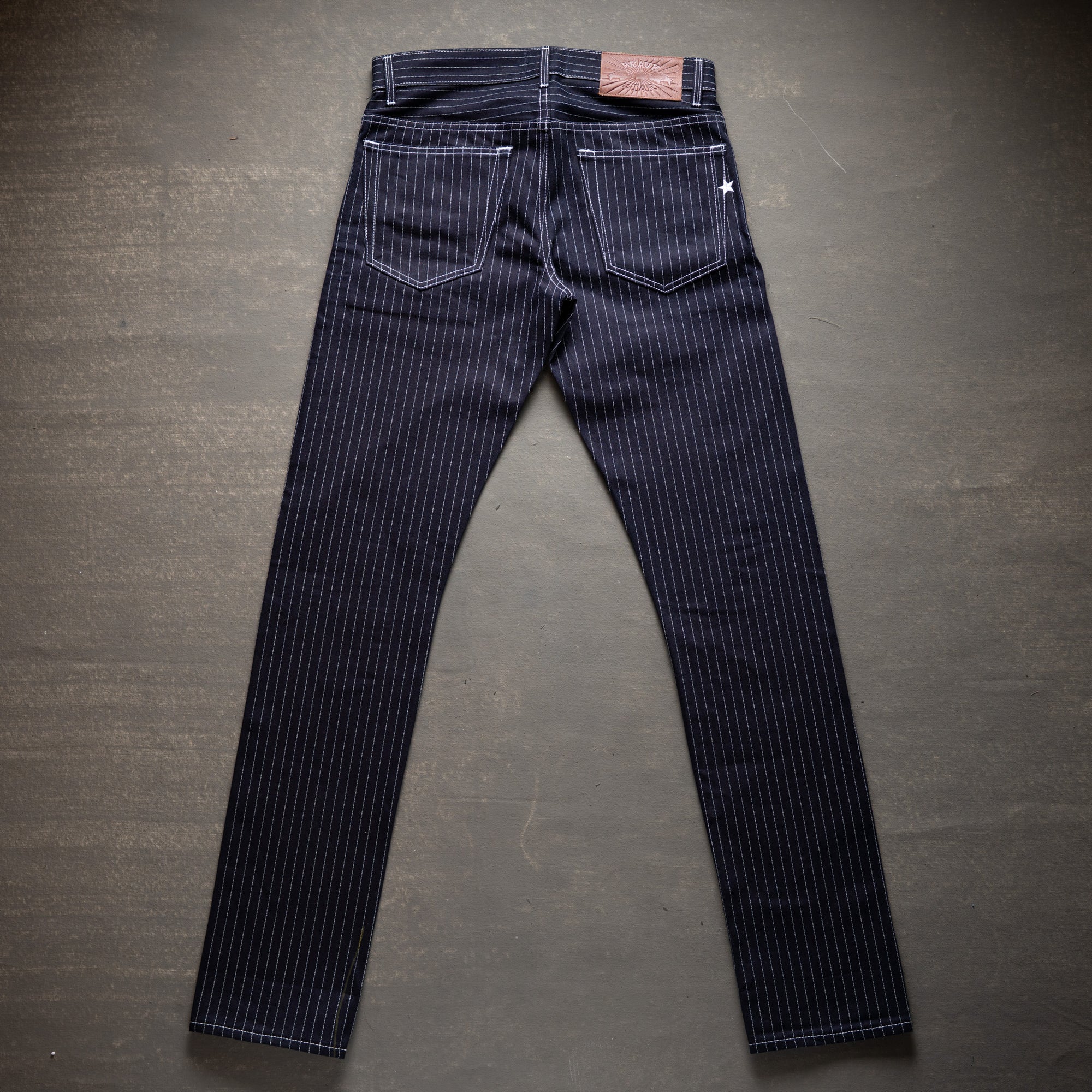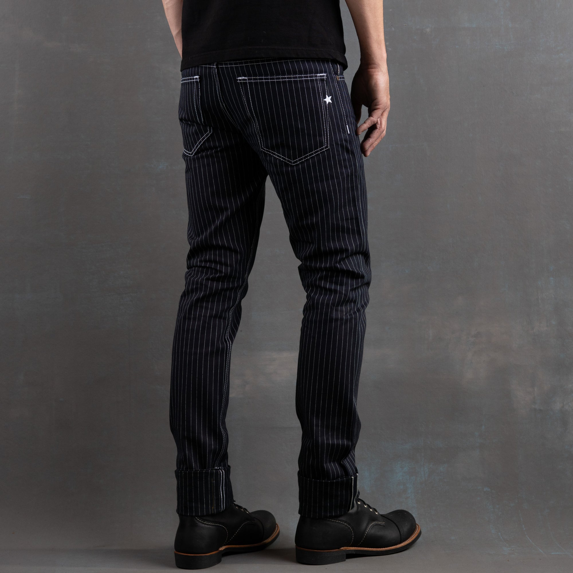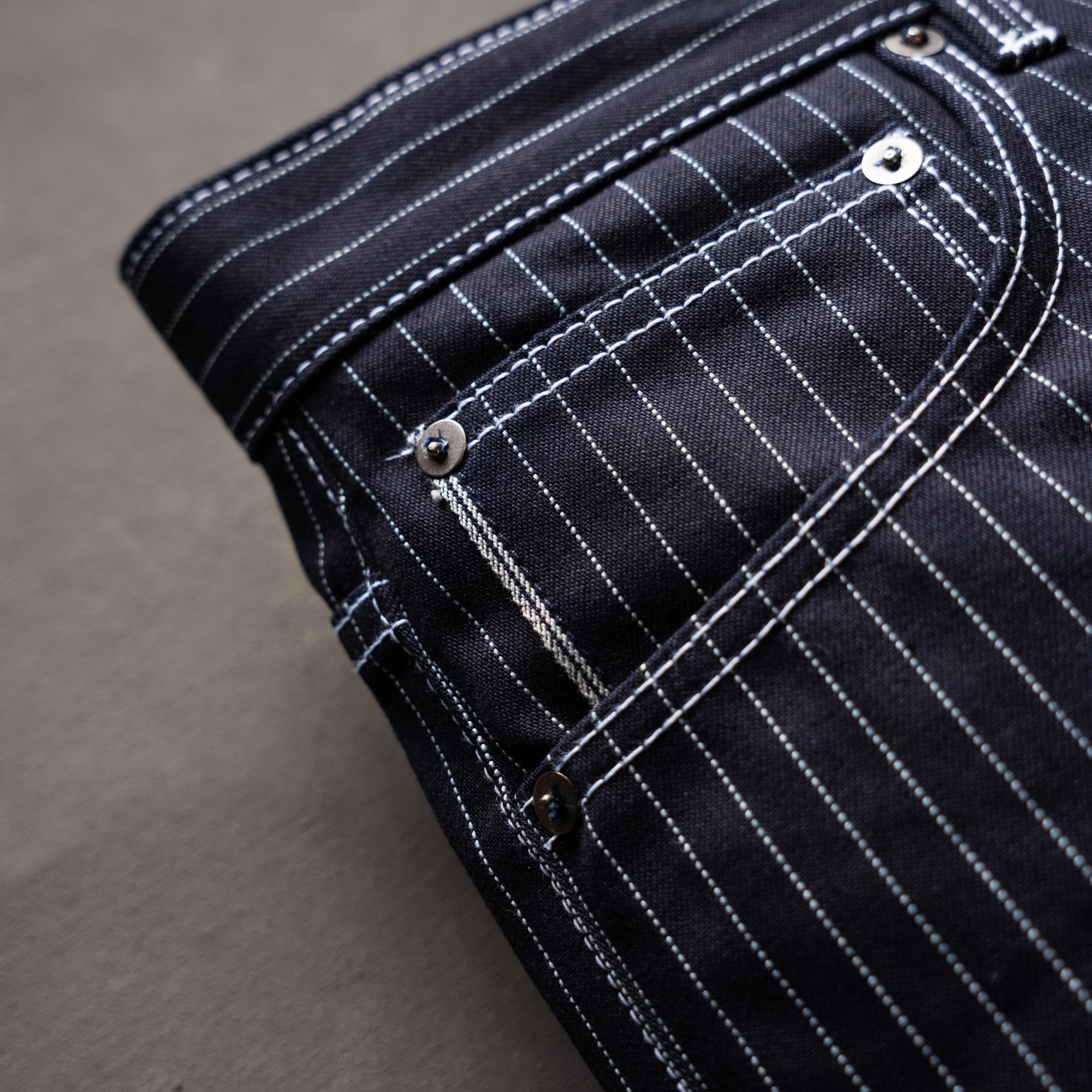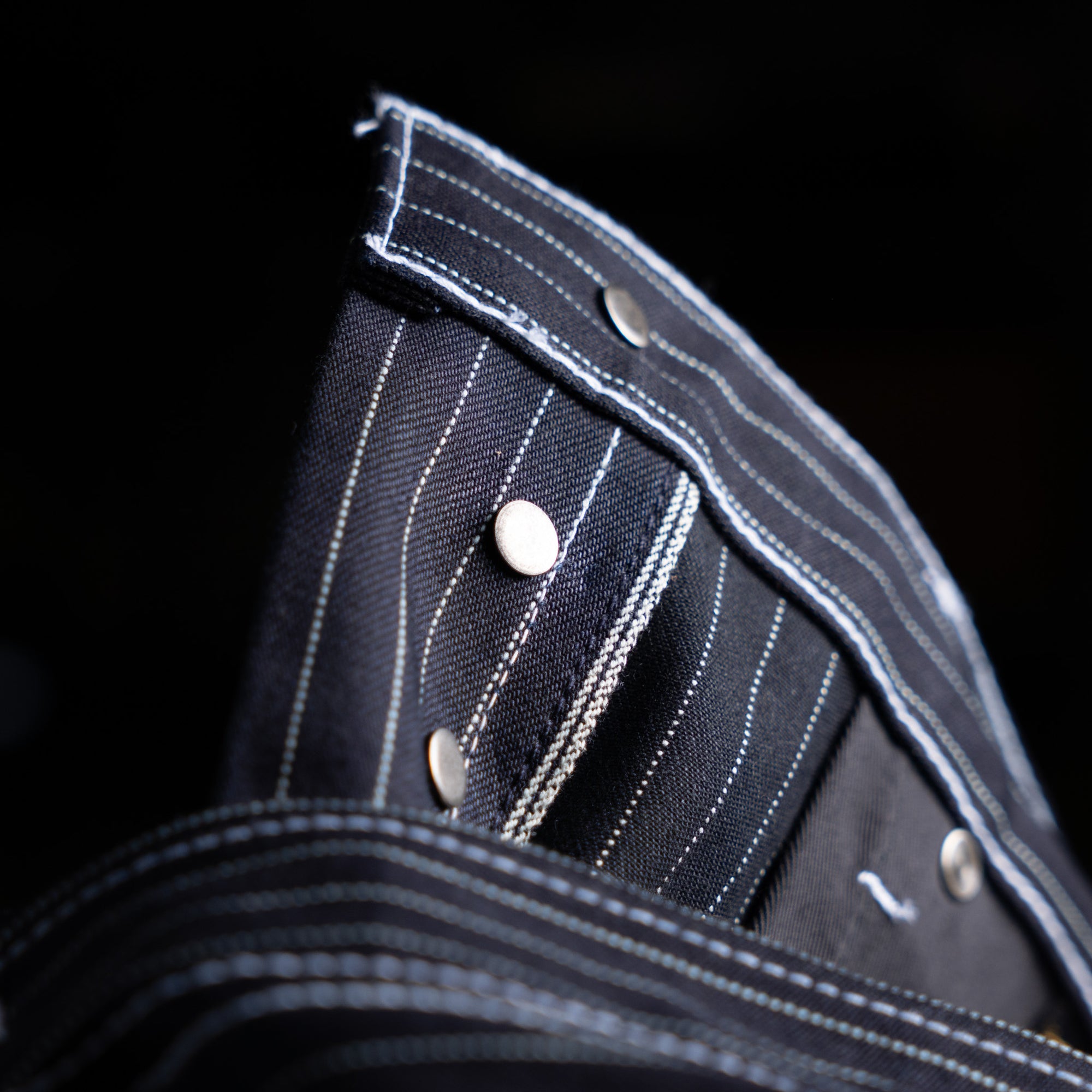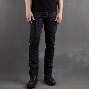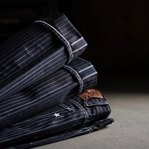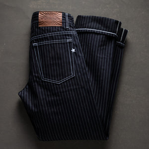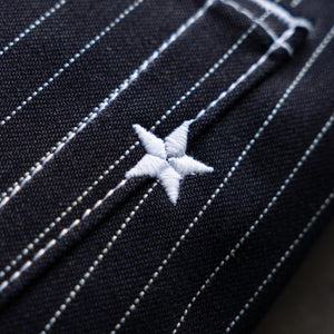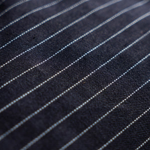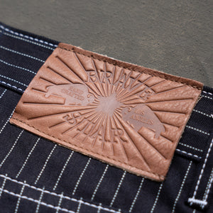This limited release of 'Wabash' Selvage Denim is a unique blend of indigo warp x black weft in a 14oz weight. It's this combo that produces the intensely dark face that allows for the Wabash pattern to contrast so vividly. The history of the Wabash pattern goes back further than that of denim, to the glory days of the railroad system in the United States. By the 1930's it was widely adopted as a standardized work wear pattern in most uniforms for service oriented jobs.