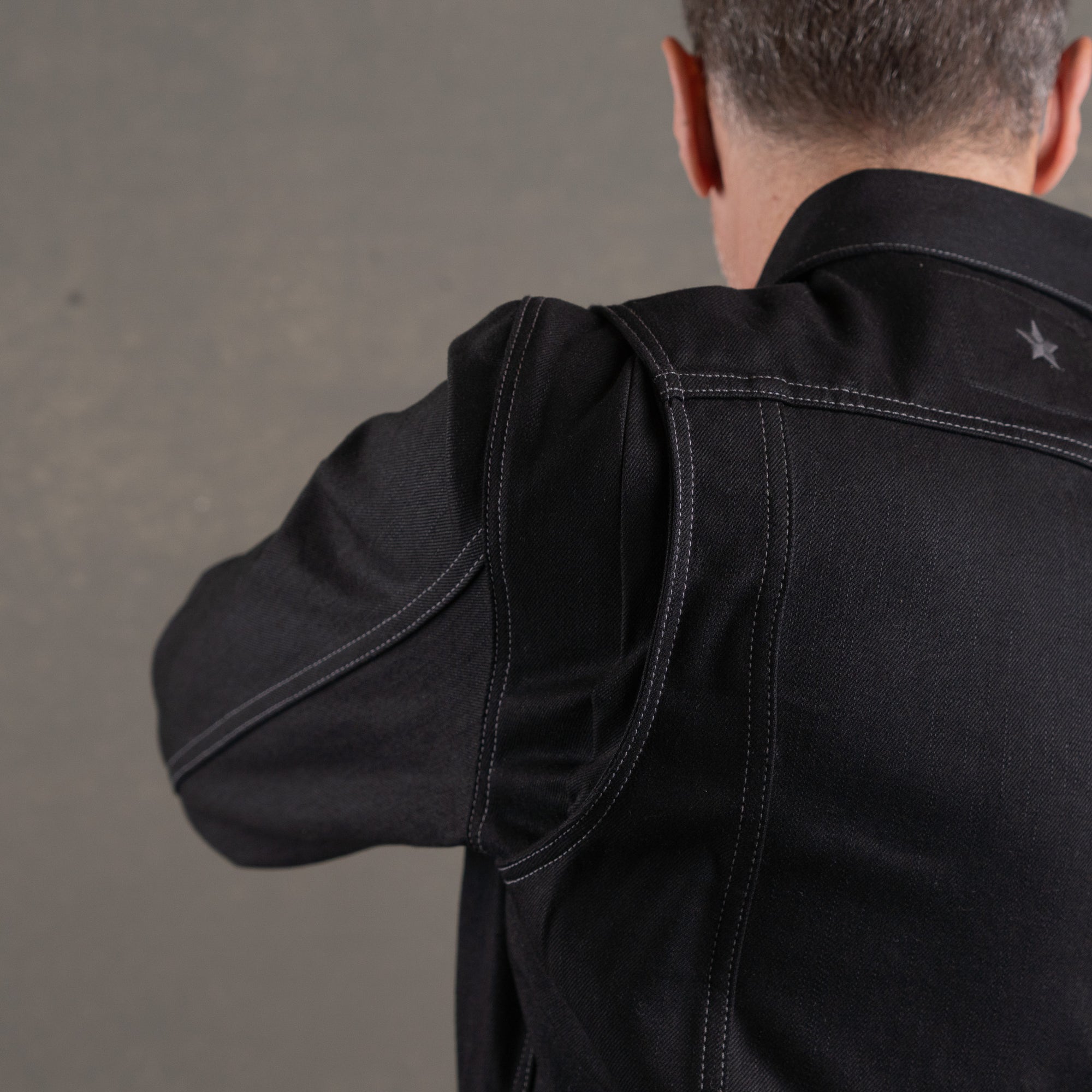 We added shoulder gussets with hidden 1.5" elastic bands, engineered to flex when you move and snap back to shape, like a gas strut. It’s a game-changer if you’ve ever felt boxed in by a classic trucker fit.