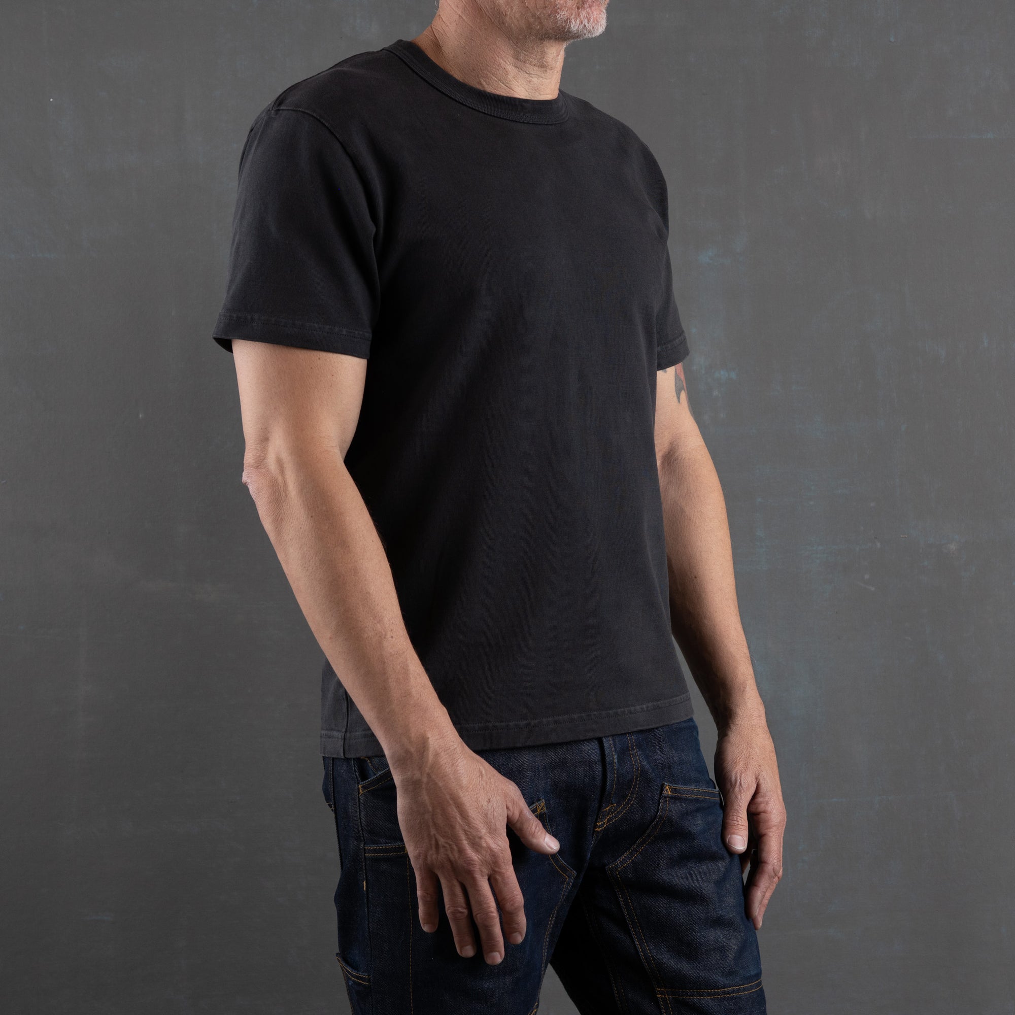 A standard fit, the pattern block utilizes side seams to contour the mid section for shape. The heavier cotton allows for a drape that is forgiving on the body. To preserve the fit, all of our fabric is washed before it's cut and sewn which allows for your T-shirt to fit right for as long as you own it, as there’s no additional shrinkage post wash.