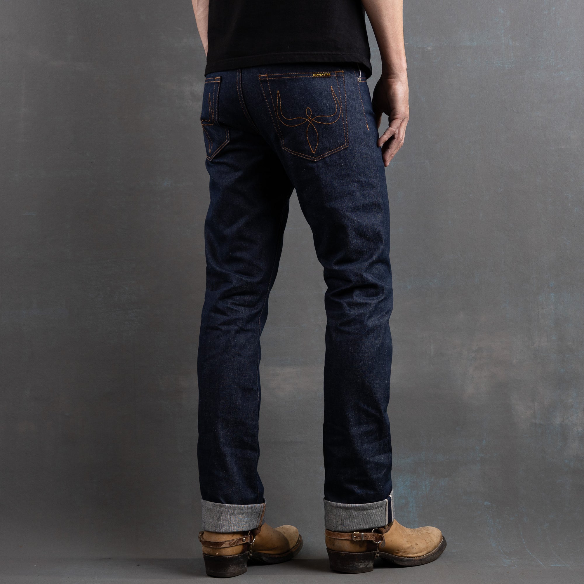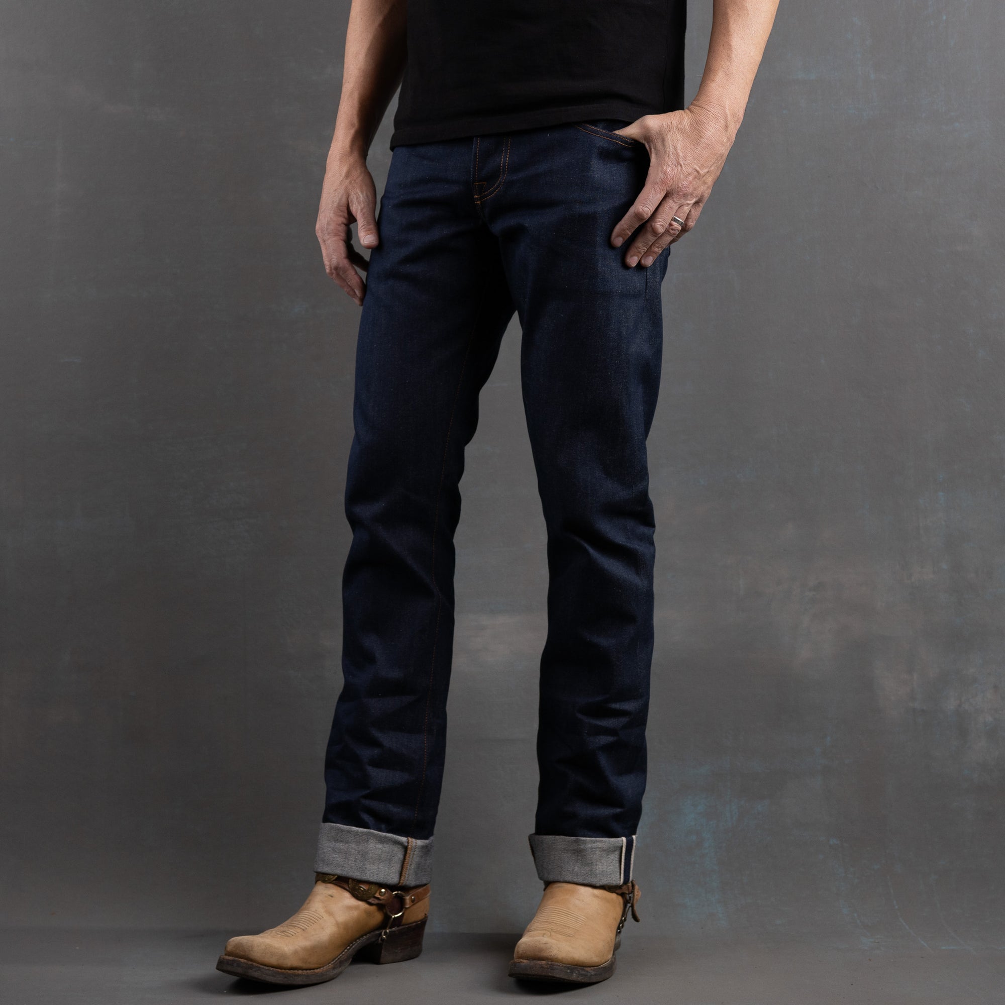 Mojave western cut is our newest fit inspired by the classic mid 50’s to mid 60’s silhouettes that became popular due to the widespread adoption of cowboy culture that permeated jeans wear during that particular era. The Mojave has a subtle knee to hem gradation that is sufficient to accompany any cowboy or work boot. This is a classic American Western silhouette that has long been neglected but whose time has come once more.