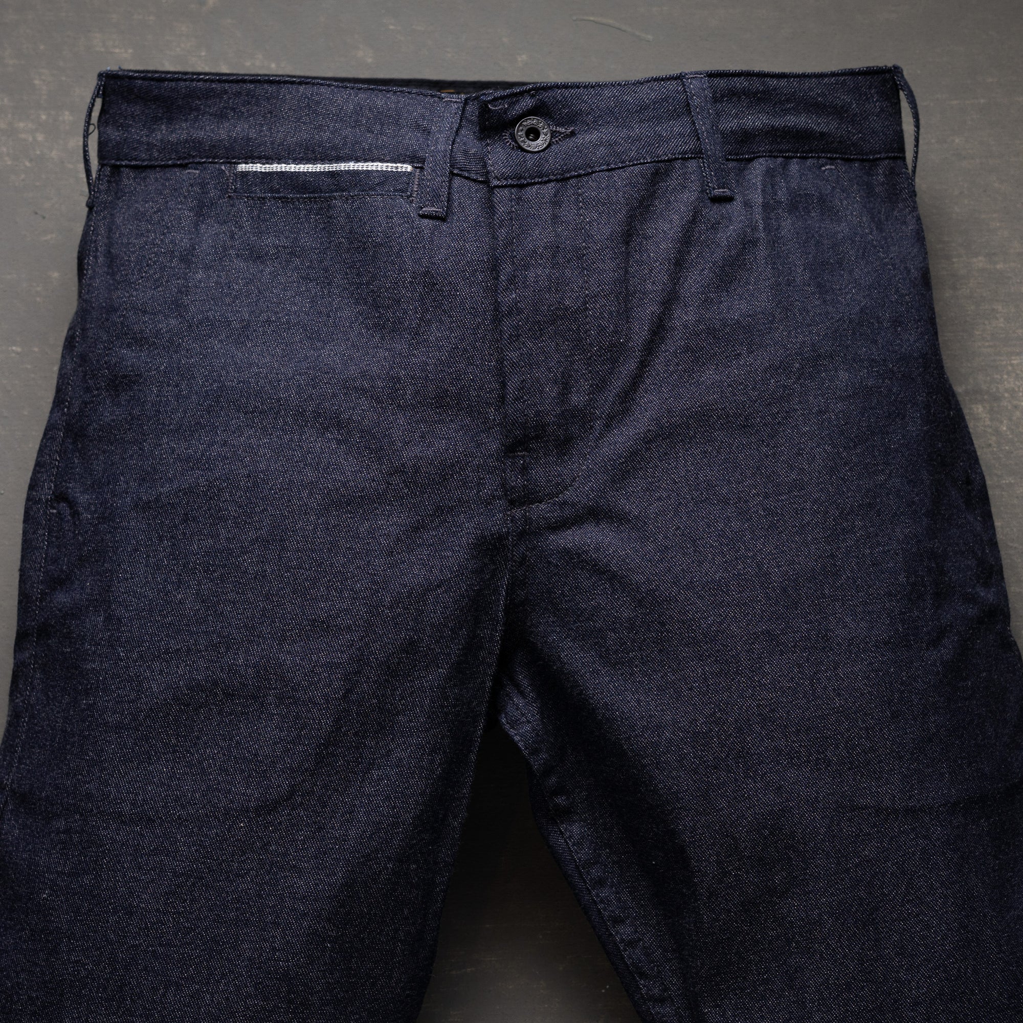 Not your average selvage. This 9oz Kaihara fabric is a standout—light enough for everyday wear, but loaded with rare character. Woven with a tri-yarn blend of indigo, gray, and natural cotton—where most mills stop at two. It features a unique double-sided selvedge ID: plain on one edge, indigo double ticker on the other. The left-hand twill adds a softer drape and smoother hand, making it the perfect match for our Marshal Chino. Precise. Rare. No gimmicks—just exceptional fabric put to honest use.