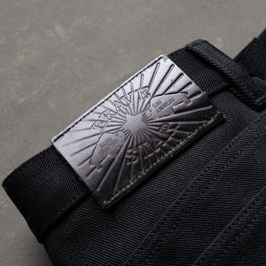 Mayhem is our heaviest double black selvage and it certainly lives up to it's infamous name. Not for the novice denim head, this sulphur warp x reactive weft offers up the blackest of black denim but will eventually fade on the warp yarns with enough wear. The deep, rich black color is achieved by utilizing the most uniform warp and weft yarns in the weave instead of uneven slub yarns. The left hand twill weave is the secret weapon in this quality as it gives the yarn that suppleness right out the gate which makes the break in process a breeze compared to similar RHT weaves. A sulphur black dye in the warp ensures awesome fade potential. Classic Red Selvage iD finishes off this stunner.