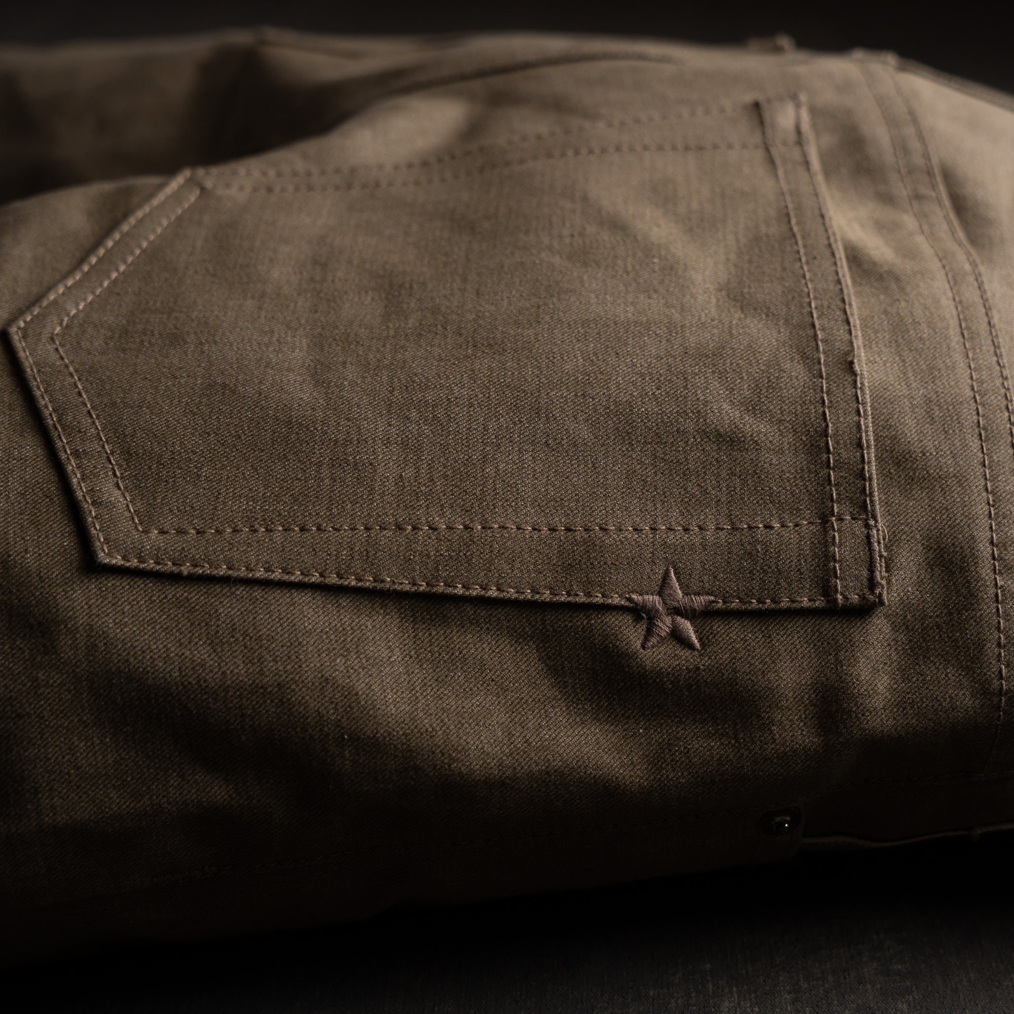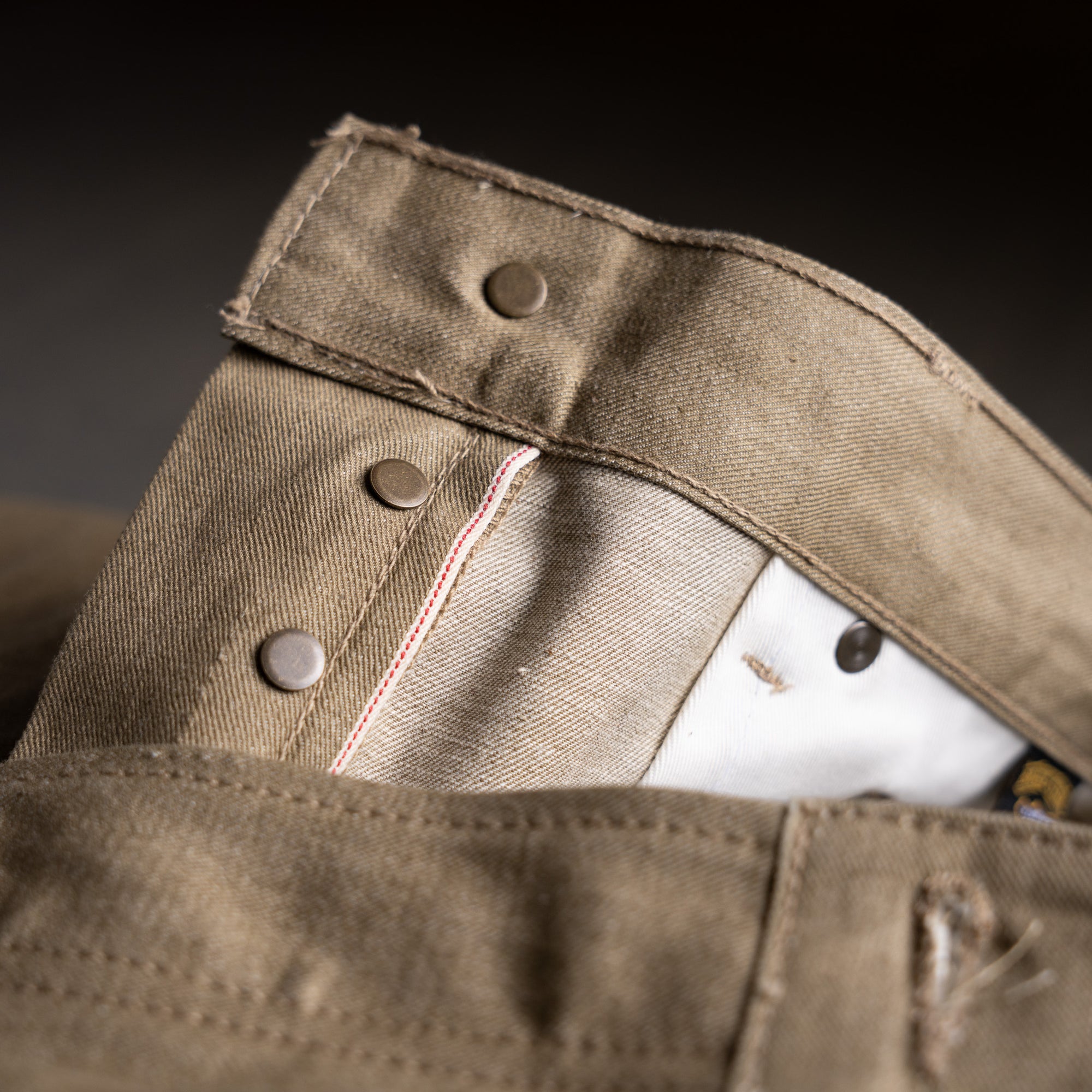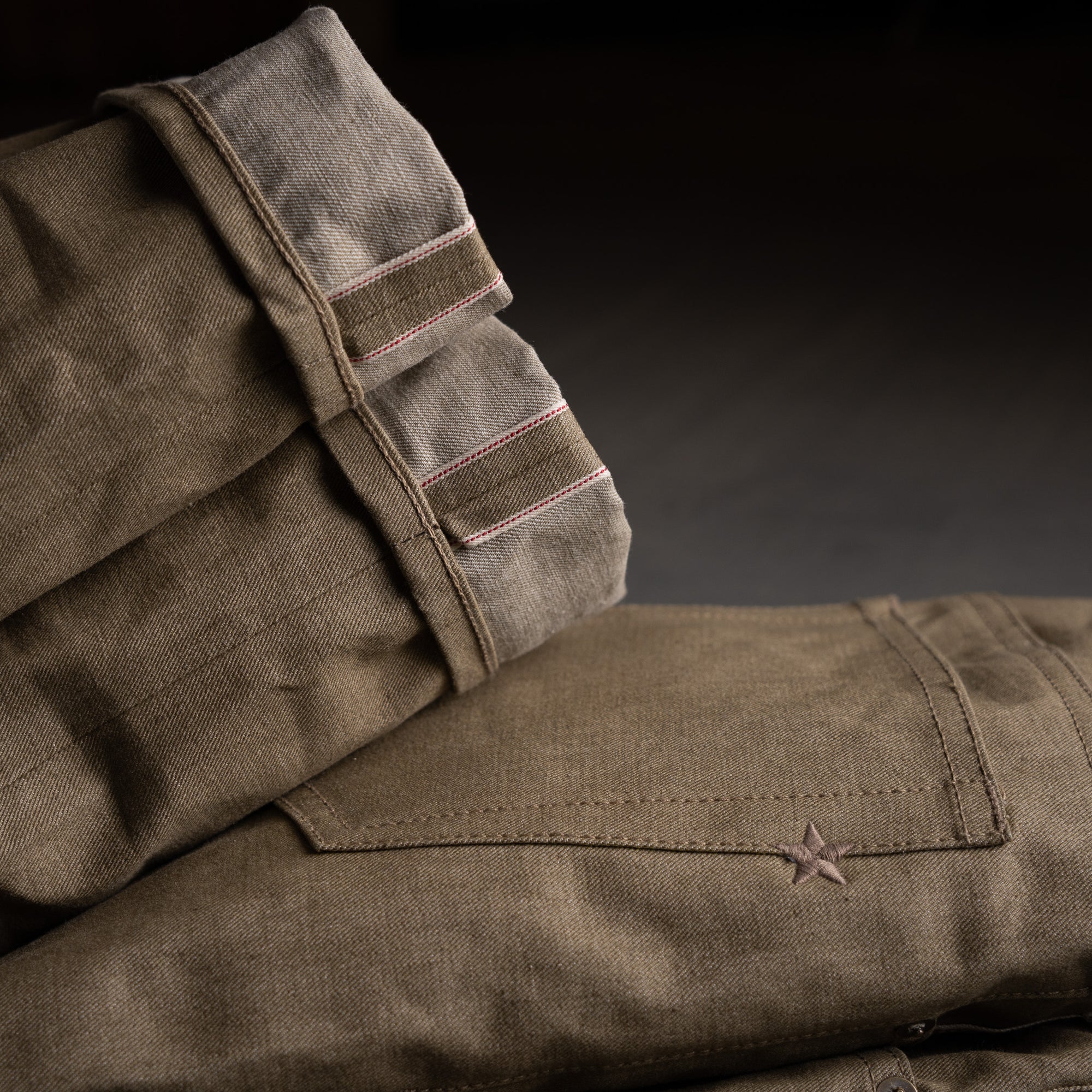Woven from a rare Japanese-milled selvage, Kombat Khaki channels the utilitarian grit of vintage military gear. The muted green-beige tone is inspired by mid-century field uniforms, washed out and battle-worn. Woven on antique shuttle looms, this fabric is dense yet breathable, with subtle slubs and texture that echo the unpredictability of true heritage denim wear.