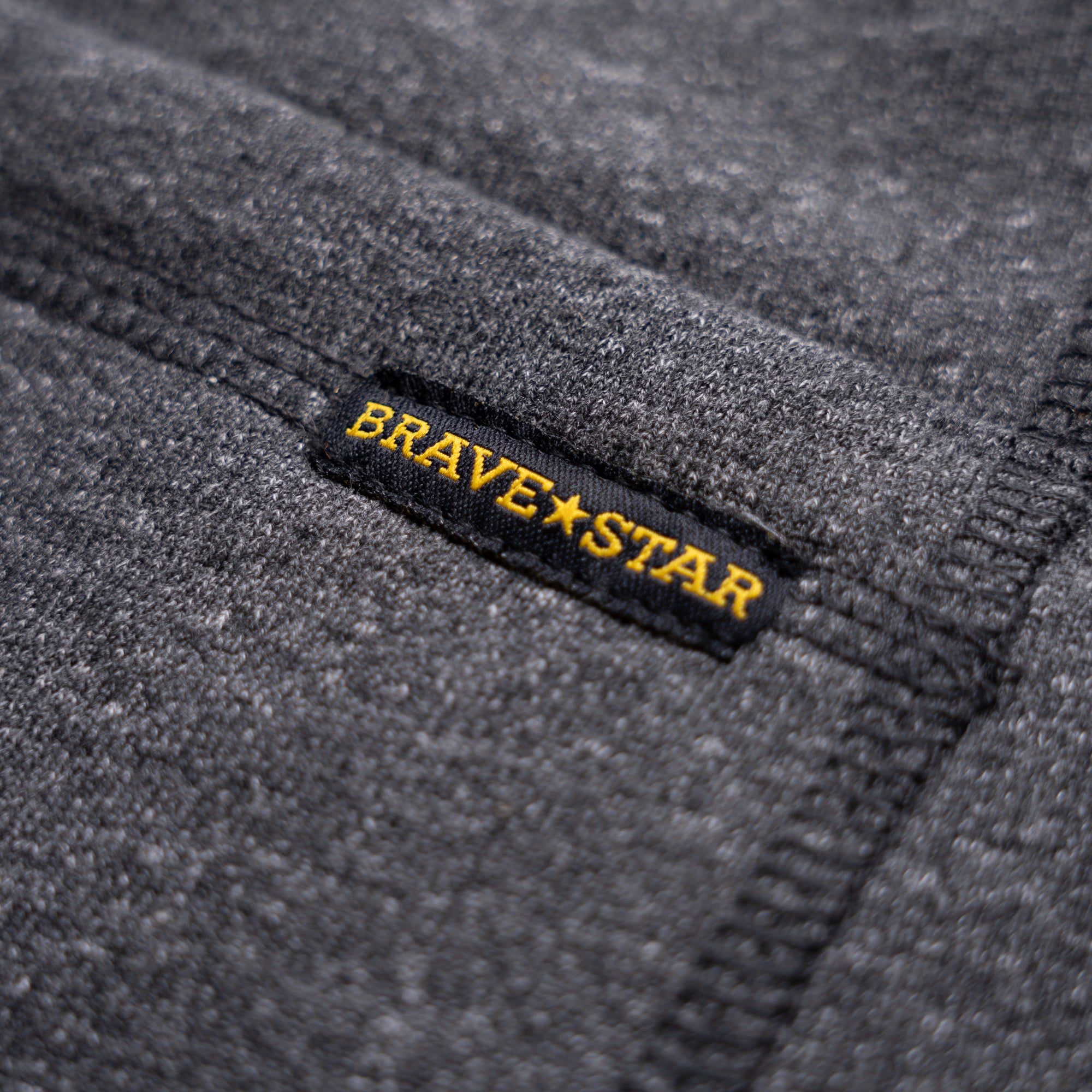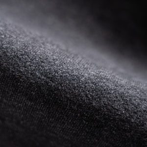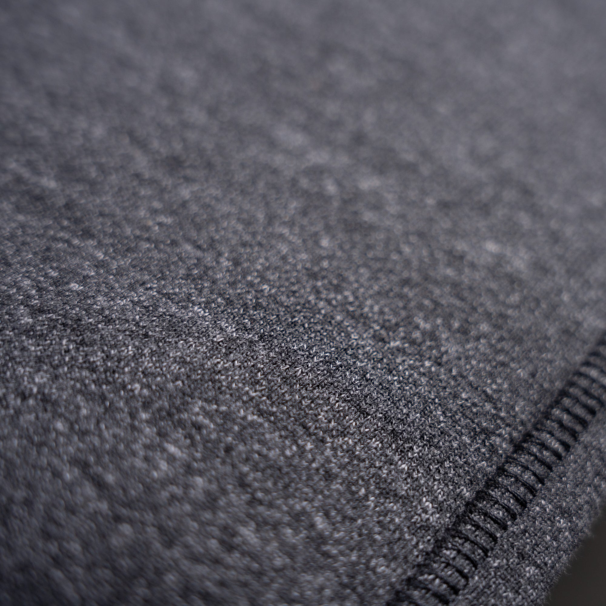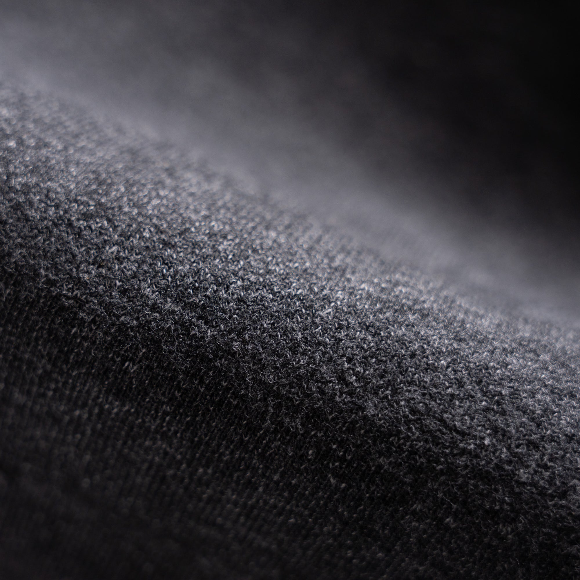 The fabric is a rugged mix of yarn-dyed greys that blend into a rich, peppery black—subtle heathering with a punch of attitude. The interior is brushed for heat-retaining comfort, giving it a soft, insulated feel without sacrificing weight or toughness. Finished with a matching 2x1 rib for a clean, durable structure. Designed to handle wear, weather, and time.