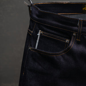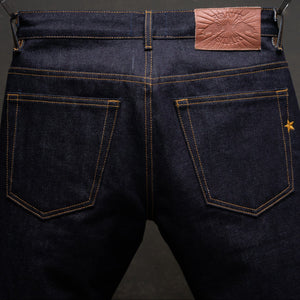 One of our darkest 16.5oz to date. To achieve a shade of indigo as deeply saturated as this would usually require both the warp and weft to be rope dyed. That's not the case with this quality which is why we're so pumped to release it. This is a traditional warp yarn rope dye with natural weft yarn yet the sheer depth of the indigo shade is unparalleled. The quality of the dyeing techniques employed by the Japanese Mills are legendary and this selvage denim is no exception. Multiple passes of the warp yarn thru the dye vats and maximum time oxidizing before reentering the vat for another pass is an ardous and expensive process but one that yields the deepest of shades. The contrast fades will be extreme and fast, making this a denim heads dream selvage for fade nirvana.