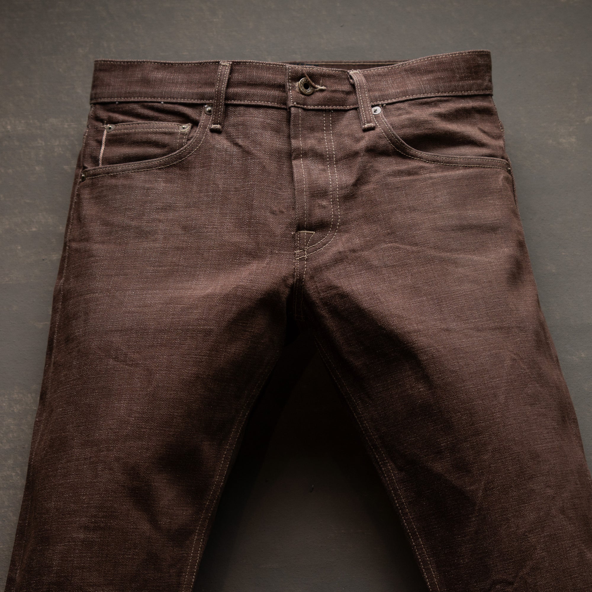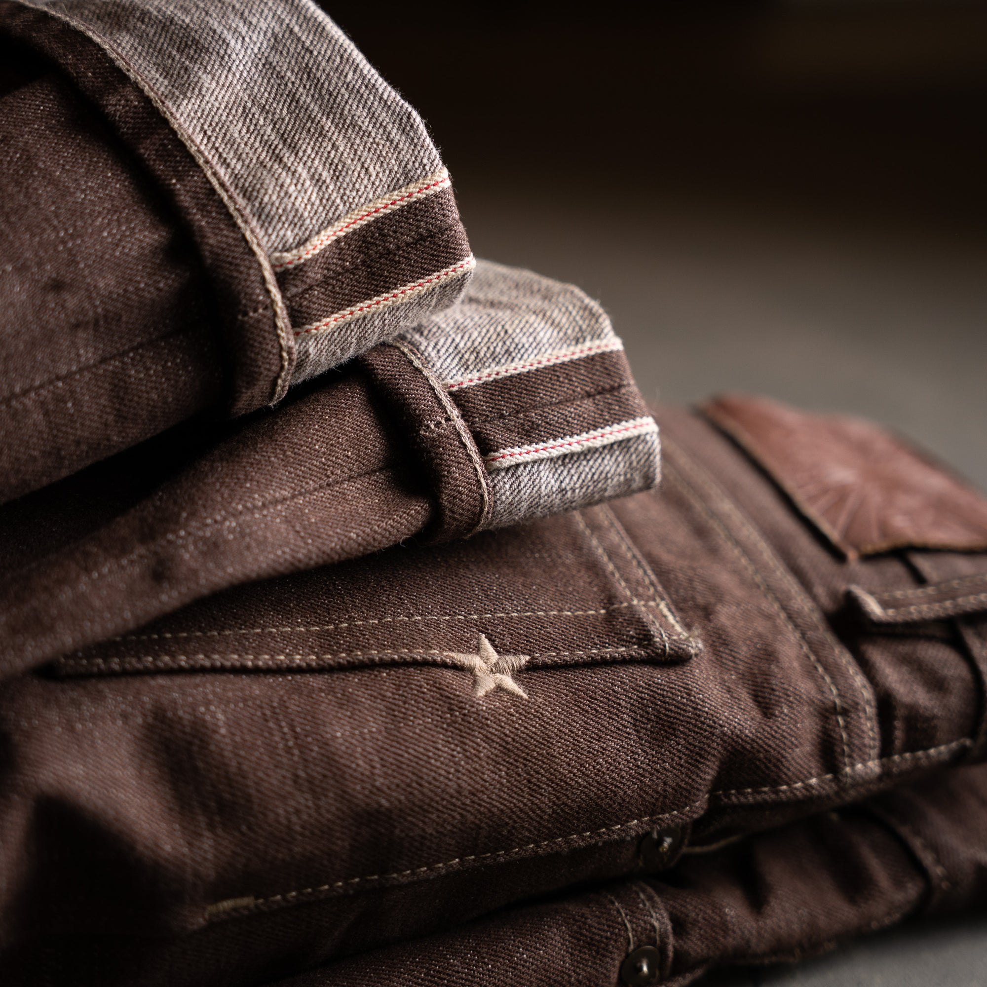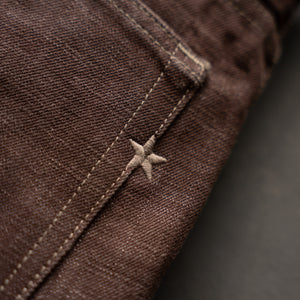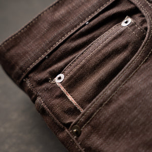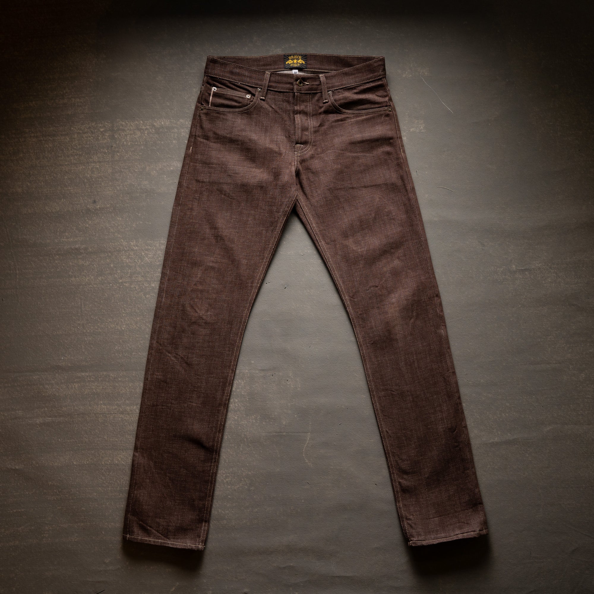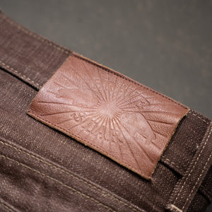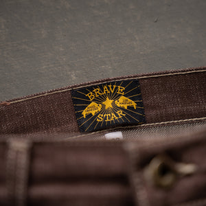 Brown Bear selvage combines the rugged texture of traditional slub warp yarn and dyeing them with warm earthy tones in a reactive brown color. The reactive dye process will fade and age like an indigo and produce a beautiful broken in rich brown with layered shades of caramel. Brown denim is a classic fabric that never goes out of style and adds a touch of rustic charm to your rotation of raw denims. This color reminds us just how versatile denim is and the potential to be one of the most unique pieces in your closetTan topstitching with antique hardware and trim throughout. A brown full grain leather patch with a deboss Brave Star logo. Red selvage iD