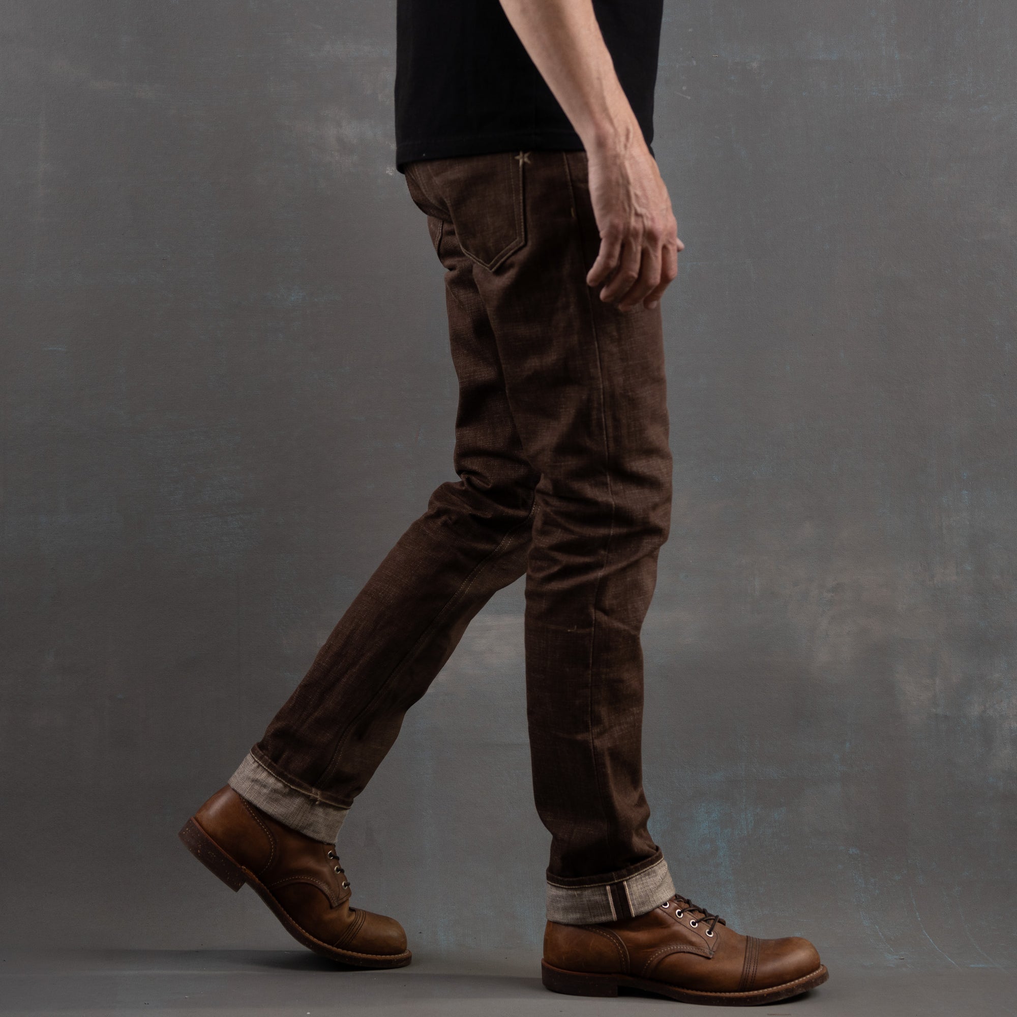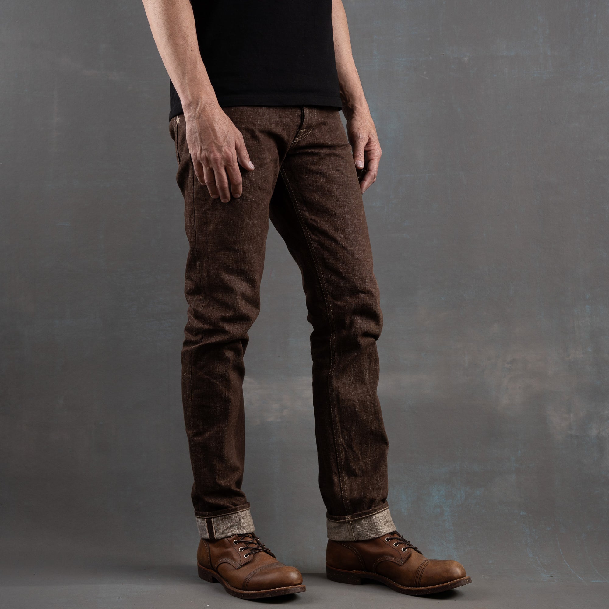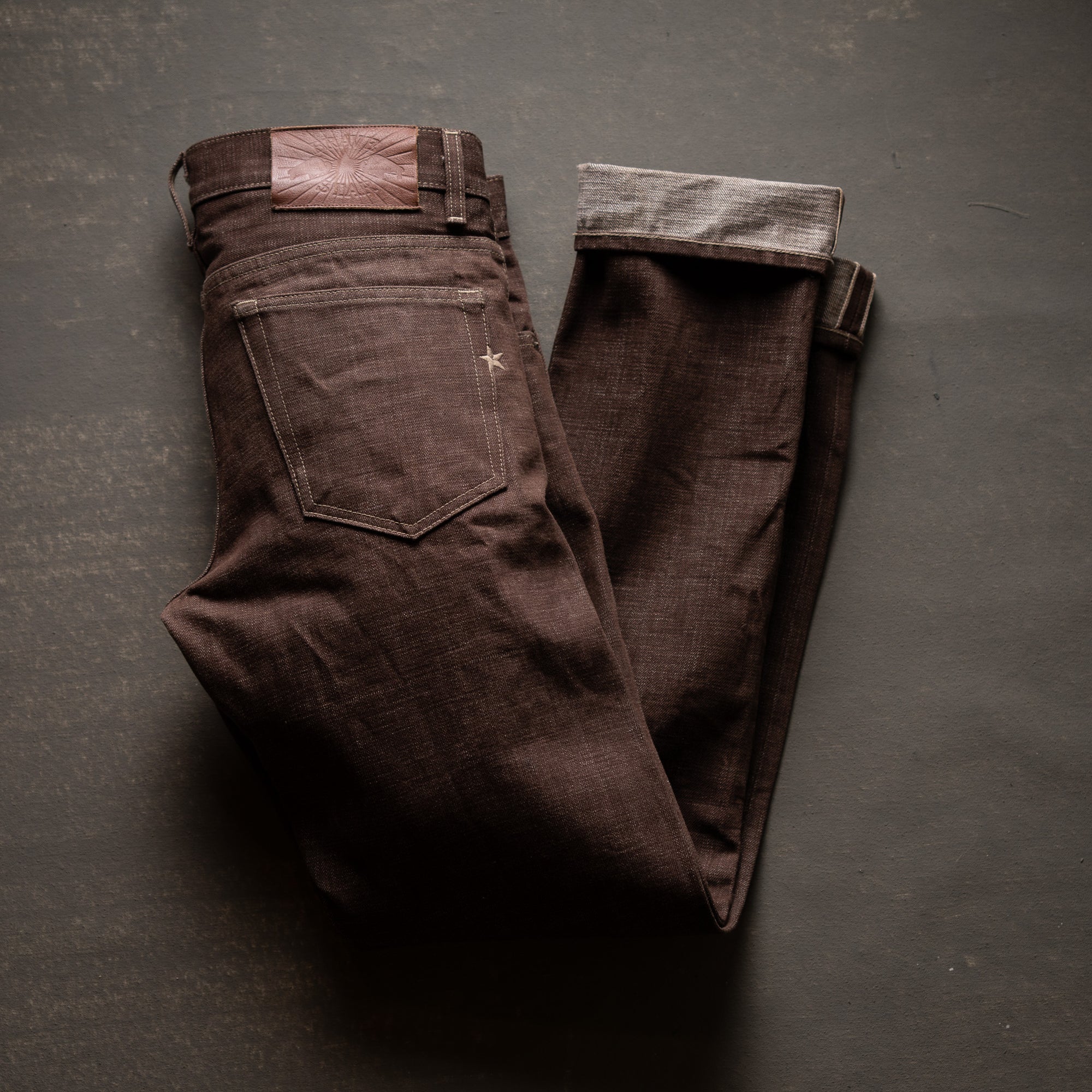 Brown Bear selvage combines the rugged texture of traditional slub warp yarn and dyeing them with warm earthy tones in a reactive brown color. The reactive dye process will fade and age like an indigo and produce a beautiful broken in rich brown with layered shades of caramel. Brown denim is a classic fabric that never goes out of style and adds a touch of rustic charm to your rotation of raw denims. This color reminds us just how versatile denim is and the potential to be one of the most unique pieces in your closetTan topstitching with antique hardware and trim throughout. A brown full grain leather patch with a deboss Brave Star logo. Red selvage iD